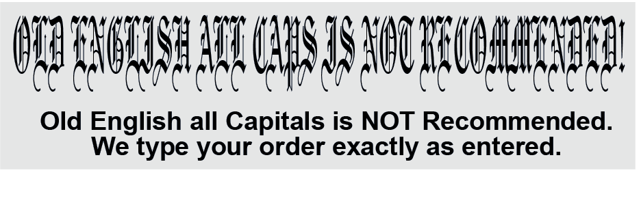 The order form itself includes instructions for how we divide the decorating areas of our mugs. We will typeset your lettering EXACTLY as you have it entered on the order form. We DO NOT recommend Old English in all capital letters (unless it’s an abbreviation or rank), as it can be difficult to read.